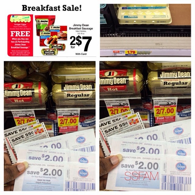 December 12, 2014 by QuidaFREE Kroger Eggs wyb Jimmy Dean Sausage! Free Eggs wyb 2 Jimmy Dean breakfast sausage – Kroger! Used 3 (Save $2.00 Kroger cash coupons from previous Softsoap/Tresemme deal), (2) Save $0.55 from your RP 12/7 insert Note – $0.10 MM!