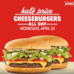 1/2 PRICE CHEESEBURGERS AT SONIC DRIVE IN 4.10.19!