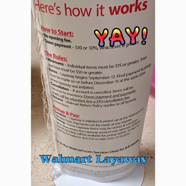 October 5, 2014 by QuidaWalmart Layaway! Walmart Layaway is here until 12/15/14! Down payment either $10 or 10%! Minimum purchase $15 or greater! Share with a friend.
